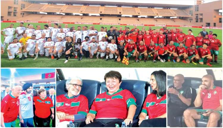 أجريت مباراة استعراضية في كرة القدم، مساء أول أمس الأحد، على أرضية ملعب مراكش الكبير، وجمعت بين مسؤولين عن قطاع الرياضة يتقدمهم فوزي لقجع، ومسؤولين عن البنك الدولي وصندوق النقد الدولي، تتقدمهم كريستالينا غورغييفا، مديرة صندوق النقد الدولي، وأجاي بانغا، رئيس البنك الدولي، وشارك فيها أيضا لاعبات ولاعبون سابقون من المنتخب الوطني، يتقدمهم نور الدين النيبت وصلاح الدين بصير وعزيز بودربالة وأحمد البهجة ومصطفى الحداوي ومروان الشماخ وجواد الزاييري.