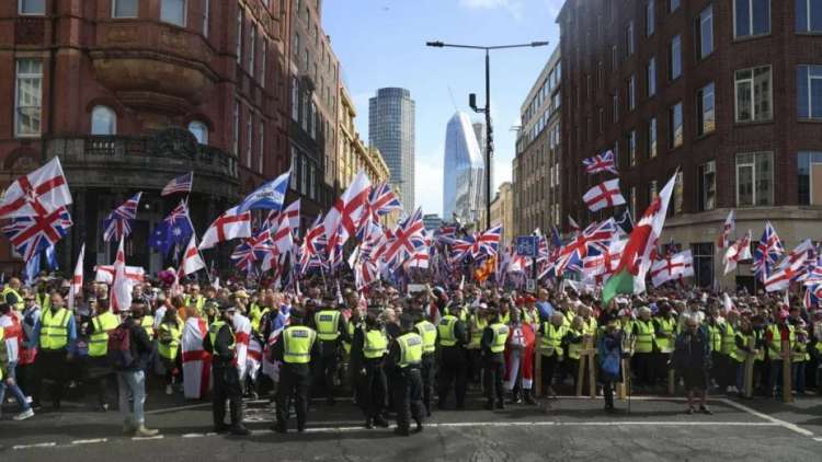 خرج أكثر من 100 ألف محتج في مسيرة بوسط لندن، يوم السبت الماضي، حاملين معهم الأعلام الوطنية، في واحدة من أكبر مظاهرات اليمين في التاريخ الحديث للمملكة المتحدة، والتي نظمها الناشط المناهض للهجرة تومي روبنسون.