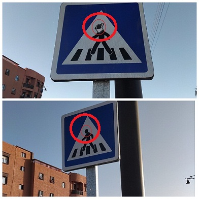 وآخر فصول هذه الاعتداءات قيام مجهول أو مجهولين، يوم الجمعة الماضي، بتشويه إحدى هذه الإشارات الخاصة بممر الراجلين بشارع محمد السادس أمام المسجد الأعظم، عبر إلصاق صورة رأس كلب فوق الصورة التي ترمز للراجلين، حيث أصبحت الصورة تحمل دلالات أخرى، وأصبح رأس الرجل المثبت في الصورة لقطع الطريق، عبارة عن رأس كلب.