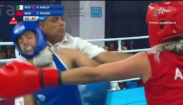 وسجل نهائي منافسات الملاكمة «سيدات» بين المغربية شيماء غادي ونظيرتها الجزائرية حجلة خليف، عن وزن (-60 كلغ)، فضيحة تحكيمية، وأحداث مشبوهة، تمثلت في الطريقة التي يتدخل بها الحكم أثناء المباراة، أبرزها اللحظة التي عمد إلى خنق الملاكمة المغربية بذراعيه، والمباراة لا تزال متواصلة، ما اعتبره كل المتتبعون مساعدة بطريقة غير مباشرة لمواطنته الملاكمة خليف، ولم يقتصر الأمر على ذلك فقط، بل وجه الحكم ذاته، خلال المباراة إنذارين مشبوهين للملاكمة المغربية غادي، ما أثر سلبا على أدائها وحصيلتها من النقاط في النزال ككل.