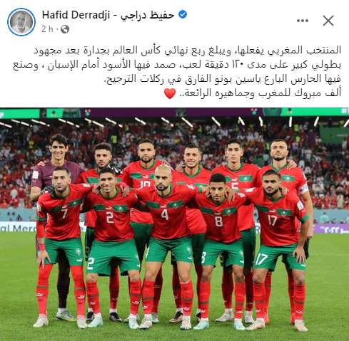 وقدّم الدراجي التهاني للمغرب وللجماهير المغربية التي صنعت الحدث بطريقة تشجيعها في الملاعب التي احتضنت مباريات أسود الأطلس في قطر.