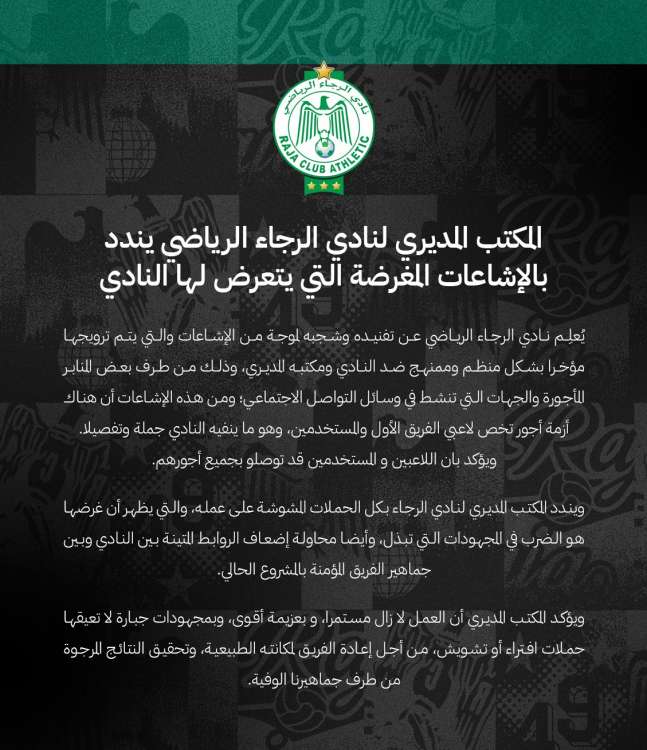 وأوضح المكتب المديري للرجاء أن “عمله مازال متواصلا وبعزيمة أقوى وبمجهودات جبارة لا تعيقها حملات التشويش، من أجل إعادة الفريق إلى مكانته الطبيعية وتحقيق النتائج المرجوة”، يضيف البلاغ.