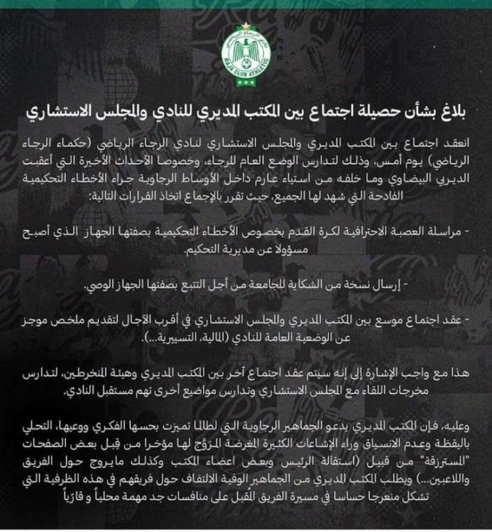ودعا البلاغ الجماهير الرجاوية إلى “التحلي باليقظة وعدم الانسياق وراء الإشاعات الكثيرة المغرضـة المـروج لها مؤخـرا مـن قبـل بعـض الصفحات “المسترزقة” من قبيل استقالة الرئيس وبعض أعضاء المكتب وكذلك ما يروج حول الفريق واللاعبين”، وطالب المكتب المديري للنادي من الجماهير الوفية الالتفاف حول فريقهم في هذه الظرفية التي تشكل منعرجا حساسا في مسيرة الفريق المقبل على منافسات جد مهمة محليا وقاريا.
