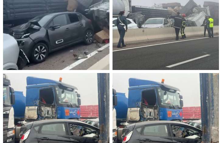 وحسب المعطيات الأولية، فإن الحادثة، التي وقعت في وقت مبكر من الصباح، وتسبب فيها الضباب الكثيف والسرعة، شملت اصطداماً جماعياً لعدد من السيارات الخفيفة والشاحنات على المقطع الطرقي المذكور.