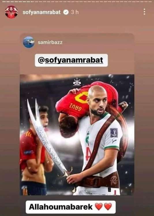 وأشارت “ماركا” إلى أن نجم المنتخب المغربي ولاعب نادي فيورونتينا الإيطالي “لم يتردد في مشاركة متابعيه الأكثر من 1.3 مليون متابع على انستغرام بعض الصور التي خضعت للمونتاج وتلقاها”. وكتبت على إحدى الصور “سفيان أمرابط مسلحا بالسيف ويحمل “جافي” المهزوم على كتفيه”.وعلّقت على صورة أخرى “سفيان امرابط يقاتل مثل مصارع ومسلح بفأس مع الإسبان”.