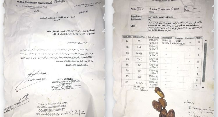 ومن بين الوثائق التي تم العثور عليها لدى «بائع الزريعة» بحي «كريمة» التابع لمقاطعة تابريكت بسلا، مراسلة حديثة صادرة عن مديرية المغرب الكبير وشؤون اتحاد المغرب العربي والاتحاد الإفريقي بوزارة الخارجية والتعاون الدولي، بتاريخ 29 يناير الماضي، موجهة إلى وزير الطاقة والمعادن والتنمية المستدامة، عزيز رباح، حول زيارة مرتقبة لوزير النفط والطاقة والمعادن الموريتاني إلى المغرب. وتتضمن المراسلة معطيات حساسة تتعلق بالديبلوماسية الخارجية، حول برمجة هذه الزيارة في أفق شهري مارس أو أبريل 2019. وتوصلت سكرتارية الوزير رباح بهذه المراسلة يوم 30 يناير الماضي، كما توصل بها ديوان الوزير في اليوم نفسه تحت رقم 1715-1232/A، قبل أن ينتهي الأمر بهذه المراسلة في ظروف غامضة لدى «بائع الزريعة» إلى جانب وثيقة أخرى تخص تتبع مسار هذه المراسلة على مستوى الوزارة.