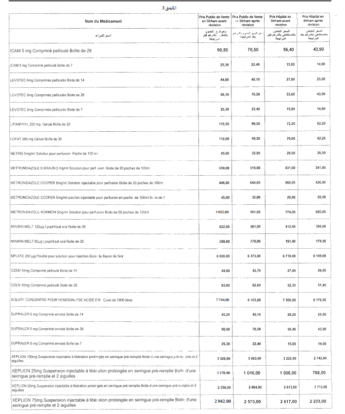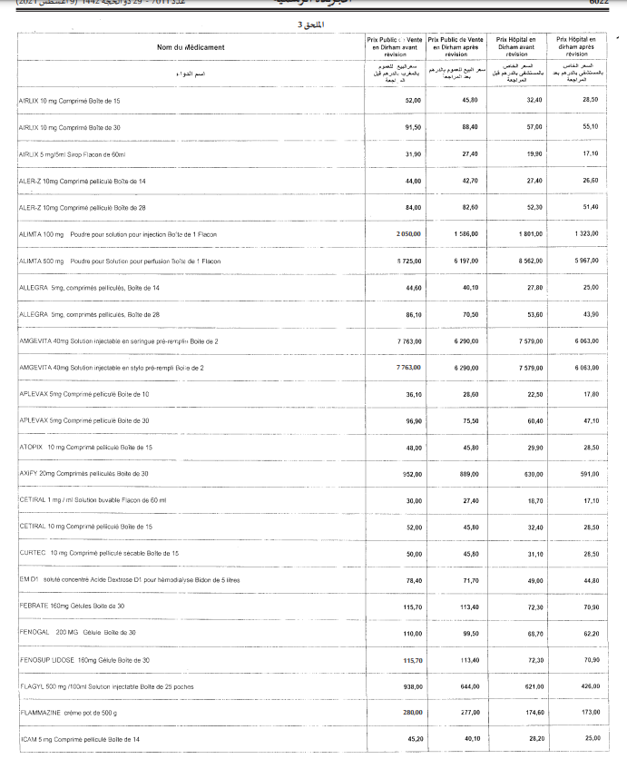 وأشار قرار وزارة الصحة إلى تخفيض ثمن دواء “ALIMTA” المستعمل في علاج الأورام السرطانية ، حيث انتقل سعره من 8.725 درهم إلى 6.197 درهم. كما تم كذلك تخفيض أسعار أدوية تستعمل في علاج عدد من الأمراض والتي تكلف كثيرا.