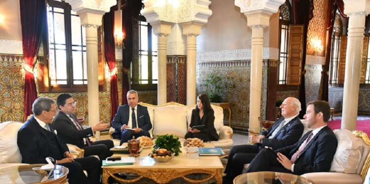 وأجرى ناصر بوريطة، وزير الشؤون الخارجية والتعاون الإفريقي والمغاربة المقيمين بالخارج، أول أمس الخميس بالرباط، مباحثات مع ستيفان دي ميستورا، المبعوث الشخصي للأمين العام للأمم المتحدة إلى الصحراء، وذلك بحضور عمر هلال، السفير الممثل الدائم للمملكة المغربية لدى هيئة الأمم المتحدة. وذكر بلاغ لوزارة الشؤون الخارجية والتعاون الإفريقي والمغاربة المقيمين بالخارج، أن الزيارة الإقليمية لـ«دي ميستورا» تندرج في إطار تنفيذ قرار مجلس الأمن رقم 2602، المعتمد بتاريخ 29 أكتوبر 2021، والذي جددت فيه الهيئة التنفيذية للأمم المتحدة دعوتها لكل الأطراف بمواصلة مشاركتها في مسلسل الموائد المستديرة، بروح من الواقعية والتوافق، من أجل الوصول إلى حل سياسي وواقعي وعملي ودائم وقائم على أساس التوافق.