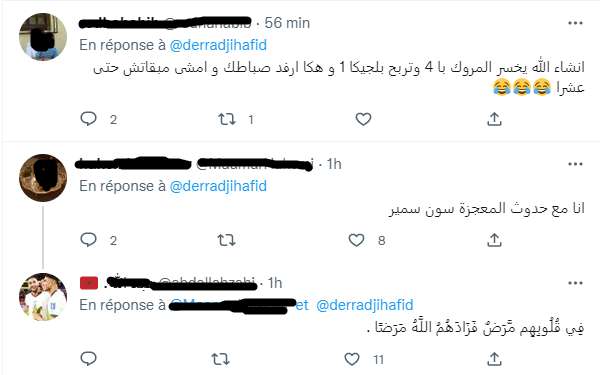 في المقابل، تناغمت عدة تغريدات لجزائريين مع الدراجي وتمنت حدوث المعجزة التي ذكرها المعلق الجزائري في تغريدته، والتي ستمنح كلا من كرواتيا وبلجيكا تأشيرتي المرور للدور الثاني وإقصاء المغرب، في إشارة إلى هزيمة “أسود الأطلس” أمام كندا، الشيء الذي دفع بمغردين مغاربة وعرب للرد عليهم، على غرار أحد المغردين الذي ردّ عليهم بالآية القرآنية “في قلوبهم مرض فزادهم الله مرضا”.
