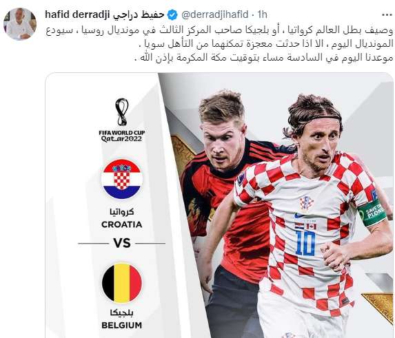 مرة أخرى، وكعادته، أثار المعلق في قنوات “بي إن سبورت” القطرية، حفيظ الدراجي، الجدل من خلال تغريدة نشرها على صفحته الرسمية في موقع التواصل الاجتماعي “تويتر”، ساعات قليلة، قُبيل مباراة الحسم للمنتخب الوطني أمام كندا، برسم الجولة الثالثة عن المجموعة السادسة لنهائيات كأس العالم قطر 2022.