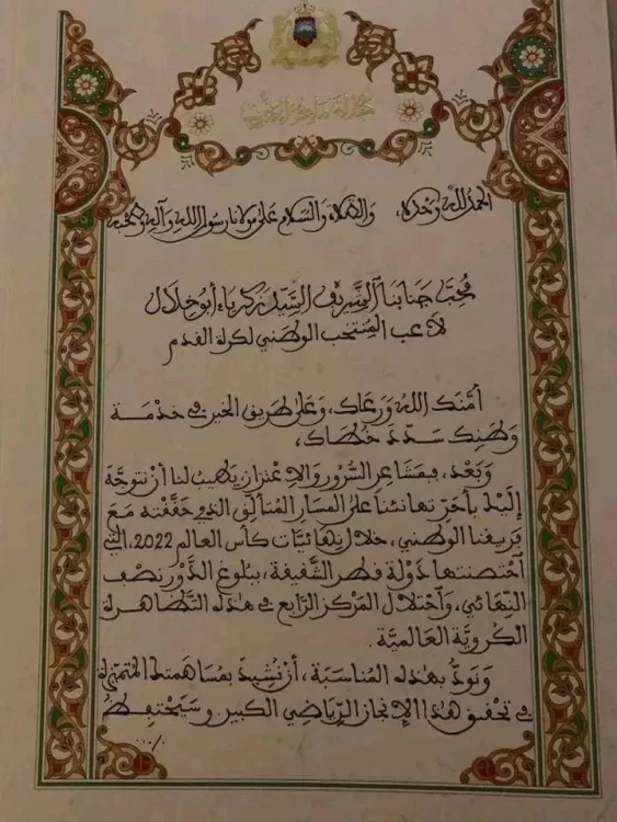 هنأ الملك محمد السادس لاعب المنتخب الوطني المغربي، زكرياء أبو خلال، بعد مساهمته في وصول المنتخب الوطني إلى نصف نهائي كأس العالم، كما أشاد بالتزامه وانضباطه، بعد مرور أيام معدودة عن مهاجمته بشدة من قبل موقع إخباري مغربي.