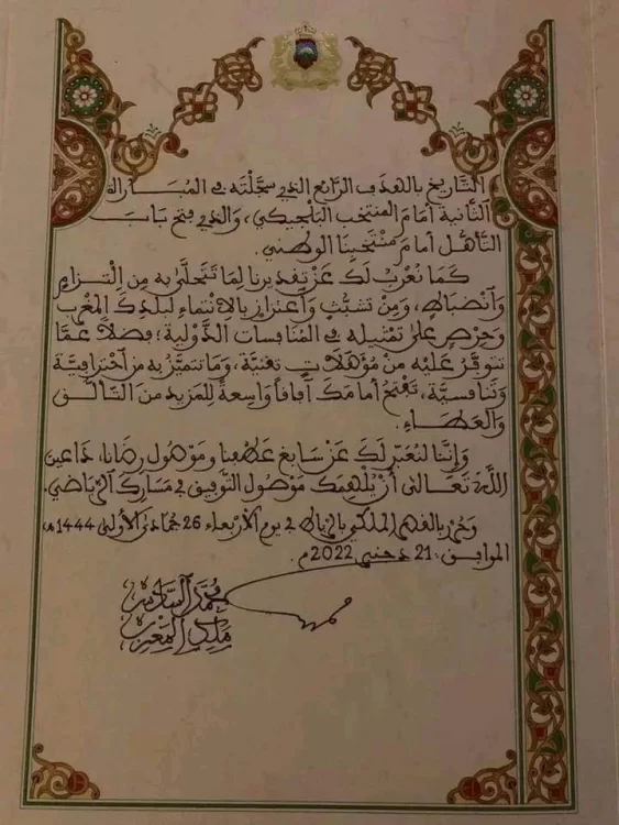 واختتم الملك رسالة تهنئته بقوله: “إنا لنعبر لك عن سابغ عطفنا وموصول رضانا، داعين الله تعالى أن يلهمك موصول التوفيق ومسارك الرياضي”.