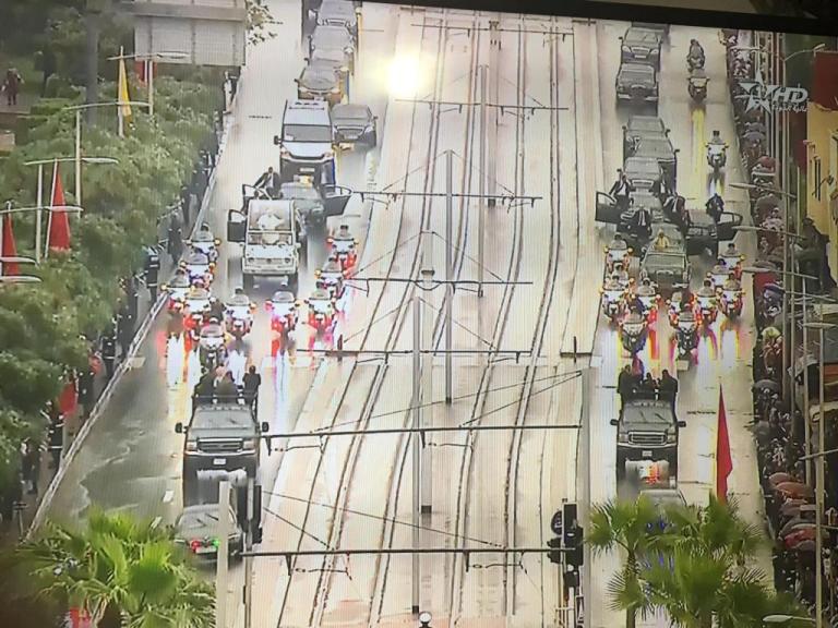 ولدى وصول موكبيهما لباحة مسجد حسان، تقدم الملك محمد السادس الذي كان مرفوقا بولي العهد الأمير مولاي الحسن، والأمير مولاي رشيد، والبابا فرانسيس، لتحية العلم على نغمات النشيدين الوطنيين للبلدين، بينما كانت المدفعية تطلق 21 طلقة ترحيبا بمقدم رئيس الكنيسة الكاثوليكية.