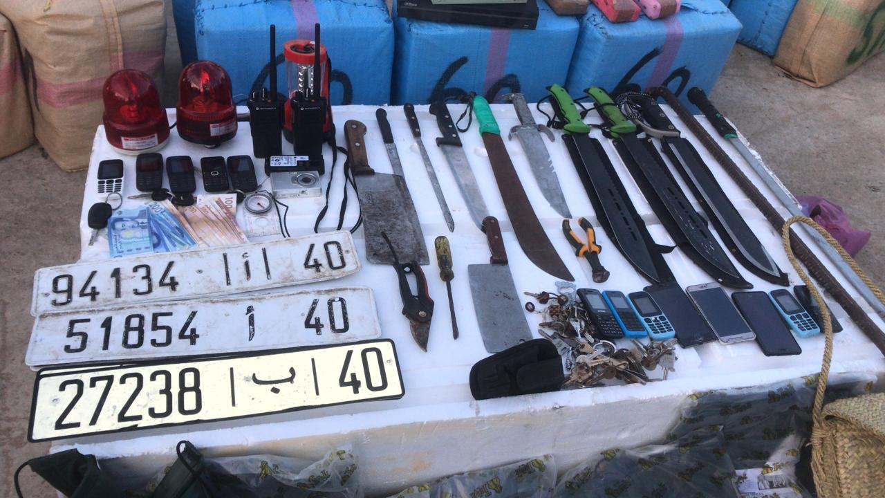 وأضاف المصدر أنه تم أيضا العثور داخل الضيعة الفلاحية وفي مسكن أحد المشتبه فيهم على آليات وتجهيزات تدخل في الاتجار الدولي للمخدرات، وهي عبارة عن قاطرة شاحنة، و8 مقطورات من الحجم الكبير تتضمن تجويفات معدة لتهريب كميات كبيرة من المخدرات، وهيكل حديدي لمقطورة، وأربع سيارات، ولوحات ترقيم مزورة، ومجموعة كبيرة من الأسلحة البيضاء من مختلف الأحجام، ومصباح كهربائي، وكاميرا للتصوير، علاوة على قناع ومبلغ مالي بالعملة الوطنية.