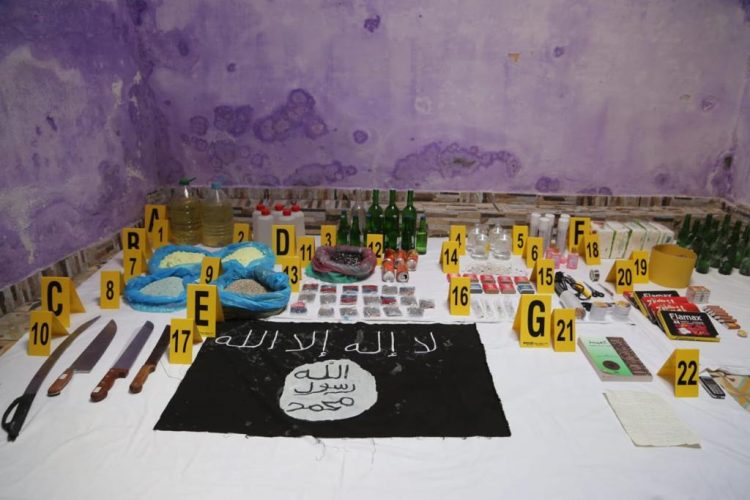وتابع المصدر أن عمليات التفتيش التي أجراها ضباط المكتب المركزي للأبحاث القضائية وخبراء مسرح الجريمة بهذا المسكن الأخير، وبمنازل المشتبه فيهم، أسفرت عن حجز راية من الثوب تجسد شعار تنظيم “داعش”، ومخطوط ورقي يتضمن نص البيعة للخليفة المزعوم لهذا التنظيم، ومجموعة من الأسلحة البيضاء المتعددة الأنواع والمختلفة الأحجام، ومعدات معلوماتية وأجهزة إلكترونية.