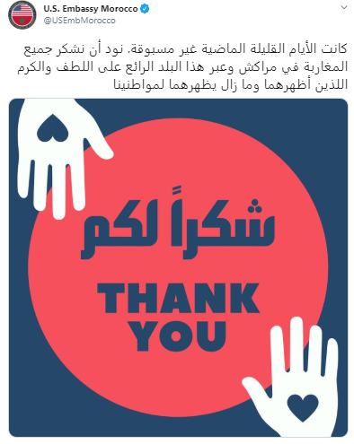 ومن جهة أخرى، أعربت السفارة الأمريكية في الرباط عن شكرها للمغرب لاستضافته أمريكيين عالقين على أراضيه. وقالت عبر حسابها على تويتر “نود أن نشكر جميع المغاربة في مراكش وفي كل هذه البلاد الرائعة على اللطف والكرم اللذين أظهروهما تجاه مواطنينا”.
