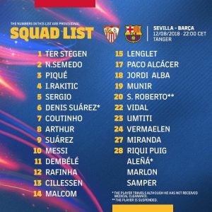 أعلن نادي برشلونة الاسباني يوم السبت ، عن لائحة اللاعبين الرسمية الذين سيتنقلون الى مدينة طنجة حيث سيخوض مهائي السوبر الاسباني أمام نادي إشبيلية يومه الأحد.