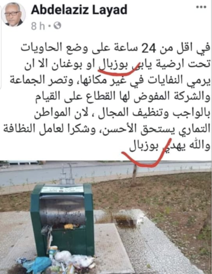 وأوضحت مصادر «الأخبار» أن نائب رئيس المجلس والبرلماني الذي انطلق في قذف المواطنين بنشر صور تتضمن أزبالا بمحيط الحاويات التحت أرضية بعبارة جارحة يطلب فيها الهداية الربانية لمن أسماهم «بوزبال»، كان عليه أن يتوجه للشركة المفوض لها تدبير قطاع النظافة، والتي تحصل على الملايير من جيوب المواطنين الذين وصفهم البرلماني بـ«بوزبال»، من أجل احترام دفاتر التحملات وتكثيف دوريات شحن الأزبال ونقلها للمطارح الخاصة، والمداومة على إفراغها وتغييرها، حتى لا يضطر المواطن لرميها بالشارع.