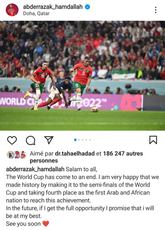 وعبر حمد الله عن سعادته بوصول المنتخب المغربي على نصف نهائي كأس العالم، وحصوله على المرتبة الرابعة قائلا في في تدوينة عبر حسابه الرسمي في موقع “انستغرام”:” السلام عليكم انتهى كأس العالم، وأنا سعيد للغاية لأننا صنعنا التاريخ بالوصول إلى نصف نهائي المونديال وحصولنا على المركز الرابع كأول دولة عربية وإفريقية تحقق هذا الإنجاز”.