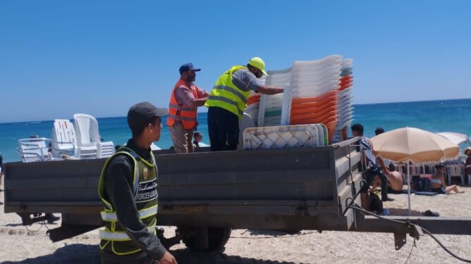 وتتواصل عمليات حجز مظلات شمسية وكراسي ومعدات وخيام، وذلك لإنهاء مبكر لجدل اختلالات وعشوائية استغلال رخص كراء المظلات الشمسية، فضلا عن تدبير استباقي للاكتظاظ والذروة السياحية ومعالجة شاملة لشكايات احتلال الواجهة البحرية ببعض الشواطئ، وعدم الالتزام بعدد المظلات المرخص كراؤها وكذا المساحة المحددة للاستغلال من قبل الجماعات الترابية المعنية.
