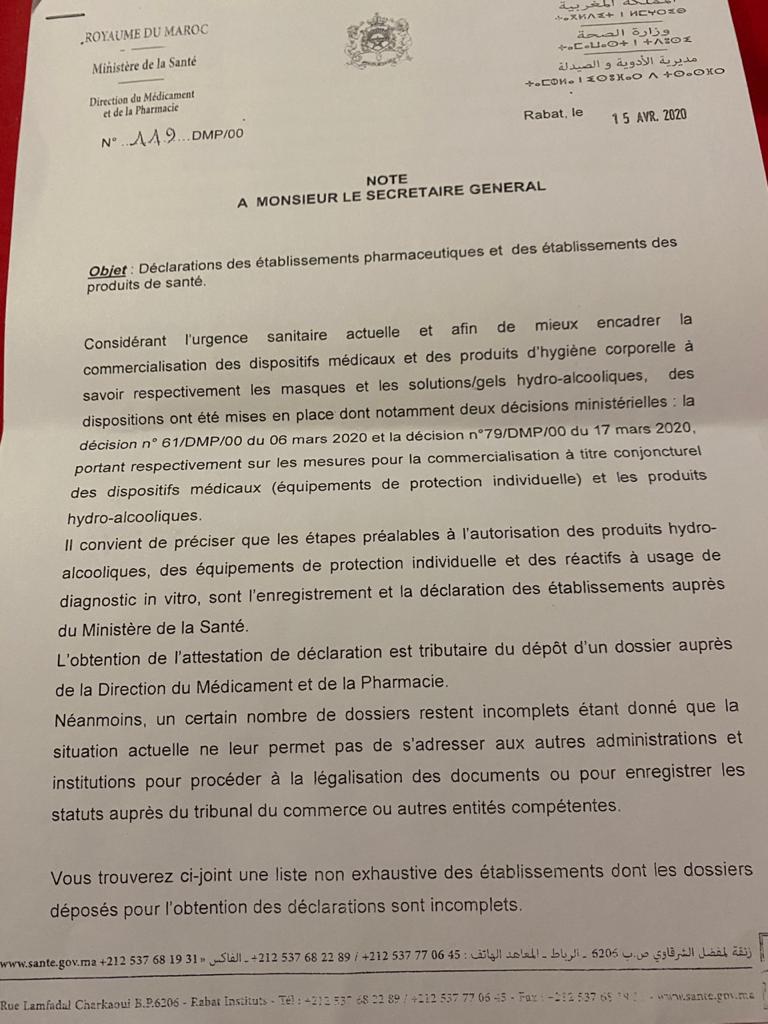 حسب وثائق تتوفر عليها «الأخبار»، فقد سبق للمديرة بالنيابة أن وجهت رسالة إلى الكاتب العام لوزارة الصحة بتاريخ 15 أبريل الماضي، طلبت من خلالها إعفاء المستلزمات الطبية من شرط التسجيل، وبررت ذلك بظروف حالات الطوارئ الصحية، التي لا تسمح للشركات بالحصول على الوثائق الضرورية لتسجيل المنتوجات بمديرية الأدوية والصيدلة، واقترحت منح تراخيص مؤقتة لمدة ثلاثة أشهر قابلة للتجديد بعد استكمال الملف.