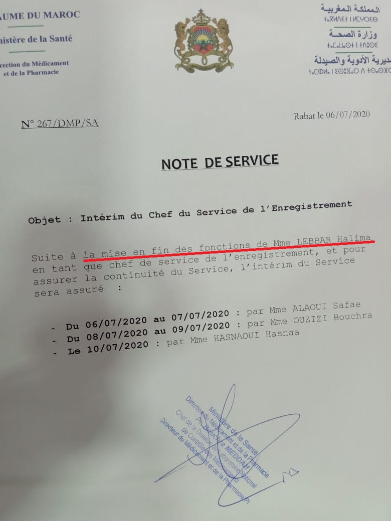 سارعت مديرة الأدوية والصيدلة، بشرى مداح، إلى إعفاء الدكتورة الصيدلانية حليمة اللبار، رئيسة مصلحة تسجيل الأدوية والمستلزمات الطبية بالمديرية، التي وجهت رسالة تظلم إلى وزير الصحة خالد آيت الطالب، واعتبرت أن قرار إعفائها غير قانوني، بعدما قضت 20 سنة من العمل داخل المديرية، وأوضحت أن المديرة أخبرتها بقرار إعفائها يوم 2 يوليوز الماضي في اجتماع بحضور مسؤولين آخرين دون أن تتوصل بأي قرار معلل، وبررت هذا القرار بوجود تقرير لمفتشية الوزارة دون أن تطلع عليه المعنية بالأمر، وخلال نفس الأسبوع منعتها من الولوج إلى مكتبها والدخول إلى قاعدة البيانات الخاصة بالأدوية والمستلزمات الطبية المخزنة بحاسوب المكتب، وتبرأت الرئيسة السابقة لمصلحة التسجيل من أي استغلال لهذه البيانات والمعلومات، وطلبت من الوزير إطلاعها على تقرير لجنة التفتيش، وهددت باللجوء إلى القضاء للطعن في قرار الإعفاء.