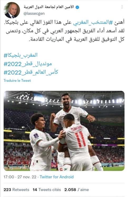 وغرد الأمين العام للجامعة العربية، على حسابه على موقع تويتر، “لقد أسعد أداء المنتخب المغربي الجمهور العربي في كل مكان، ونتمنى التوفيق للفرق العربية في المباريات القادمة”.