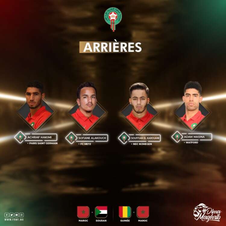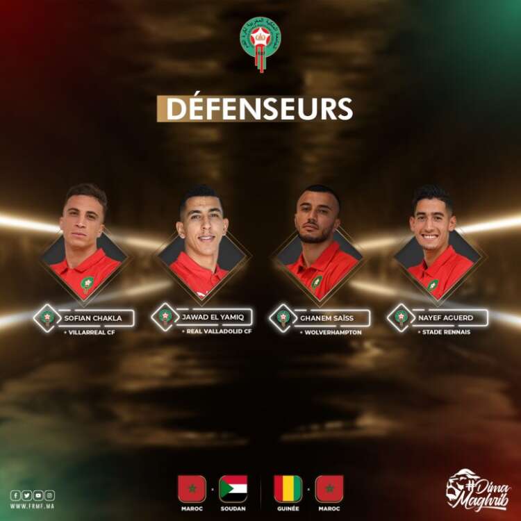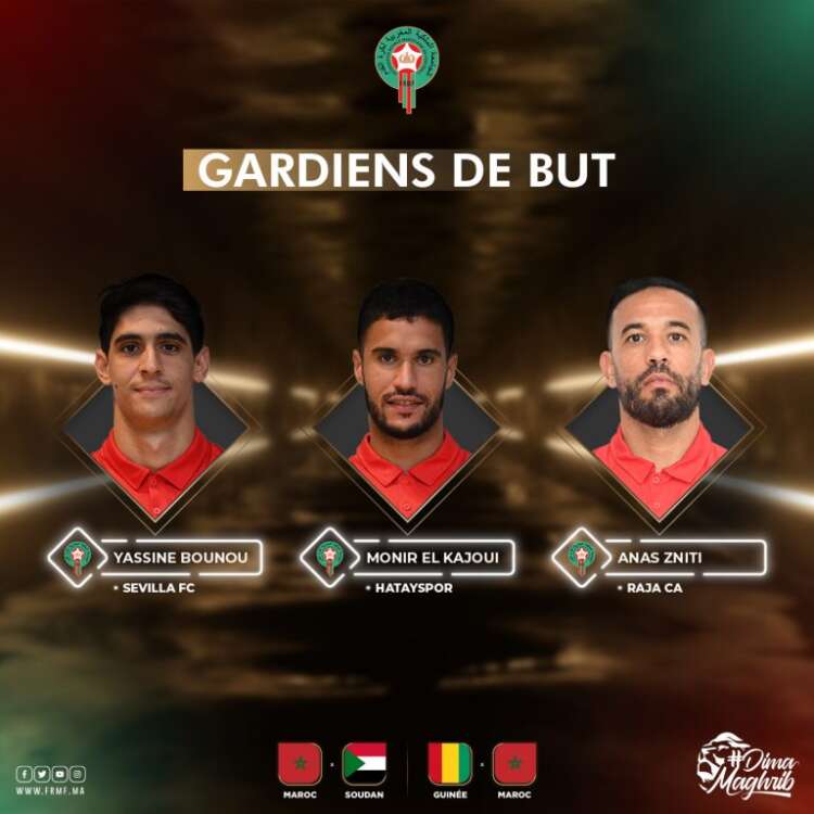 وضمت اللائحة التي ستخوض غمار التصفيات أمام كل من منتخبي السودان يوم الخميس 02 شتنبر وغينيا يوم الإثنين 06 شتنبر 2021، كل من ياسين بونو، منير المحمدي، أنس الزنيتي، سفيان شاكلة، جواد الياميق، غانم ساسس، نايف أكرد، أشرف حكيمي، سفيان علاكوش، سفيان كرواني، ادام ماسينا.