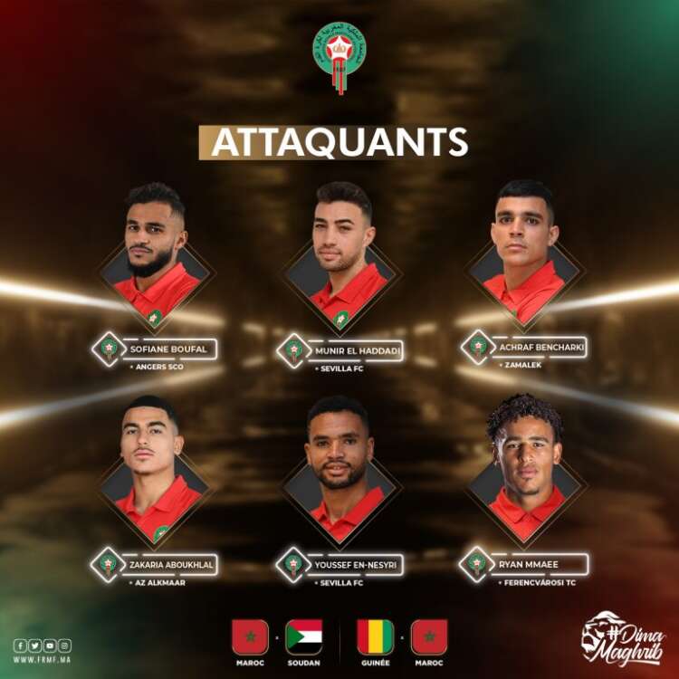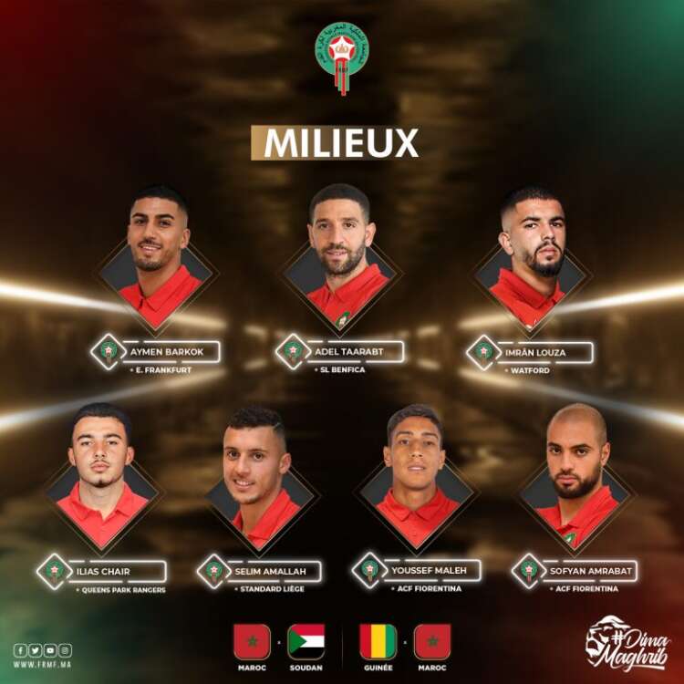 وضمت اللائحة أيضا في وسط الميدان، أيمن برقوق، عادل تاعرابت، عمران لوزا، إلياس الشعير، سليم أملاح، يوسف مالح، سفيان أمرابط، وفي خط الهجوم: سفيان بوفال، منير الحدادي، أشرف بنشرقي، زكرياء بوخلال، يوسف النصيري، ريان مايي.