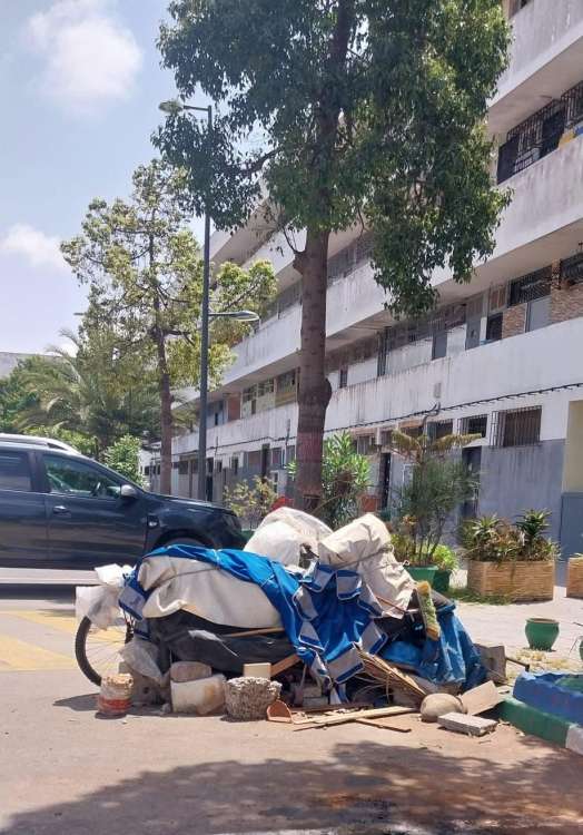 وتتراكم أكوام من القمامة والنفايات على الرصيف، بما في ذلك أغطية بلاستيكية، وبقايا الخشب، ومواد مهملة، مما يشوه جمالية الحي ويعكس إهمالا بيئيا صارخا.
