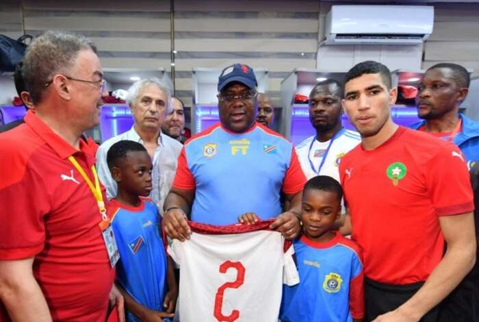 وكانت اللقطة الأبرز نزول الرئيس الكونغولي الذي تابع المباراة من المدرجات إلى غرفة ملابس المنتخب الوطني رفقة ابنيه للحصول على صورة تذكارية رفقة حكيمي، وذلك بحضور رئيس الجامعة الملكية المغربية لكرة القدم فوزي لقجع، إذ منح حكيمي قميصه لنجلي الرئيس الكونغولي، الذي كان في قمة الروح الرياضية وعبر عن سعادته بحلول المنتخب الوطني المغربي بكينشاسا، متمنيا مباراة عودة في مستوى الأنصار والمنتخب الأفضل يتأهل ويمثل القارة الإفريقية خير تمثيل في مونديال قطر المقبل.