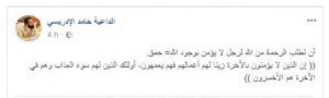 وأضاف الإدريسي في تدوينة أخرى : ” أن تطلب الرحمة من الله لرجل لا يؤمن بوجود الله= حمق. (( إن الذين لا يؤمنون بالآخرة زينا لهم أعمالهم فهم يعمهون، أولئك الذين لهم سوء العذاب وهم في الآخرة هم الأخسرون ))”.