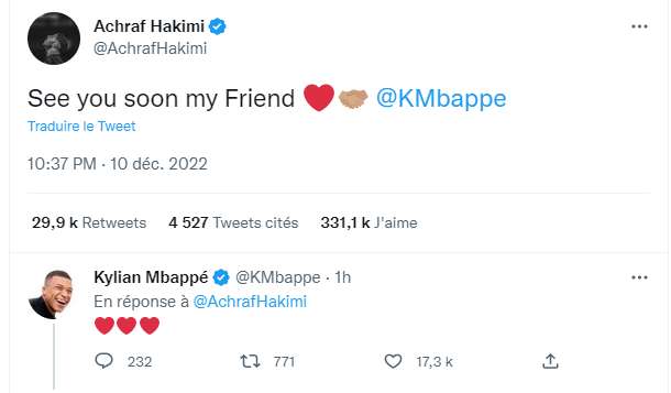 وتفاعل الآلاف من مرتادي موقع التواصل الاجتماعي “تويتر” مع الدردشة المونديالية بين النجمين، من خلال العديد من التعاليق على التغريدتين والإعجاب وإعادة تغريدها، مشيرين إلى أن المباراة التي ستجمع المنتخب الوطني المغربي بنظيره الفرنسي، مساء الأربعاء المقبل، ستكون قمة حارقة وستشهد ندية بين حكيمي وصديقه “مبابي”.