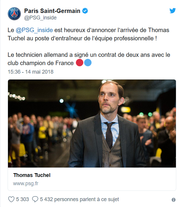 أعلن نادي باريس سان جيرمان الفرنسي، رسميا، الاثنين 14 ماي، عن تعيين الألماني توماس توخيل مدربا جديدا للفريق ، خلفا للإسباني أوناي إيمري.
