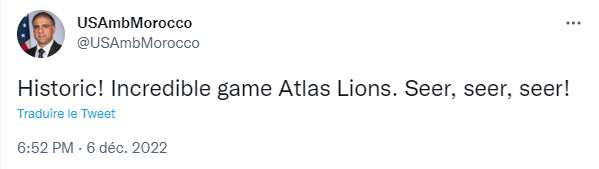 وفاجأ السفير الأمريكي، الذي يتقن اللغة العربية، المغاربة بتدوينة على صفحته الرسمية في موقع التواصل الاجتماعي “تويتر” تم إعادة تغريدها من صفحة سفارة الولايات المتحدة بالرباط على “تويتر”، أعرب فيها عن اللحظة التاريخية التي سجلتها “أسود الأطلس” في تاريخ مشاركتها في المونديال، بعد التأهل لأول مرة لدور ربع النهائي.