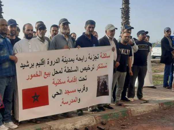 احتشد العشرات من المواطنين من سكان حي رابحة ببلدية الدروة بإقليم برشيد، أول أمس الثلاثاء، مدعومين بأطر من المجتمع المدني، في وقفة احتجاجية لإسماع صوتهم إلى المسؤولين الإقليميين والمركزيين، نددوا خلالها باعتزام السلطات المختصة الترخيص لصاحب متجر لبيع الخمور وسط أحياء آهلة بالسكان.