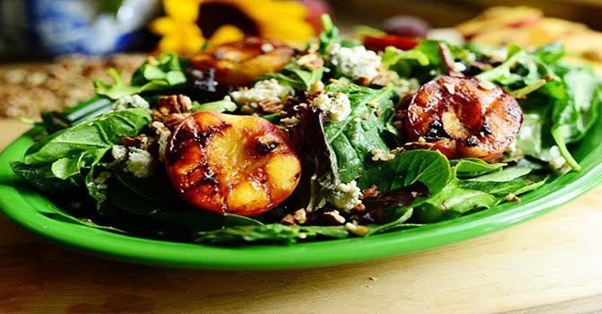 نقشر الخوخ و ننزع بذوره و نتبل بالملح والفلفل، السكر، الثوم النعناع و الأوريجانو المجفف و نتركه على جنب إلى أن يتشرب التوابل. ثم نشوي الخوخ على فحم للشواء أو نضعه بورق الألمنيوم ونضعه في الفرن، و بعد أن ينضج نضعه على السلطة من فوق.