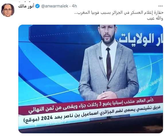 وتفاعل عدد من المعارضين الجزائريين مع شطحات الإعلام الجزائري، على غرار ما نشره الإعلامي أنور مالك في صفحته على “تويتر” تعليقا على شريط إخباري لإحدى القنوات الجزائرية، التي لم ترد إسم المغرب في قصاصتها الإخبارية، وقال “حقارة إعلام العسكر في الجزائر بسبب فوبيا المغرب.. والله عيب”.