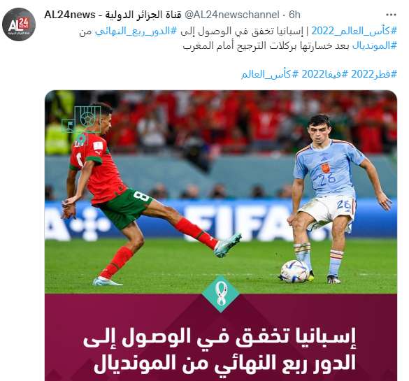 وأصبح الخبر لدى الإعلام الجزائري مرتبط بإقصاء إسبانيا بركلات الجزاء وليس تأهل المغرب لأول مرة في تاريخ المشاركات العربية لربع نهائي المونديال.