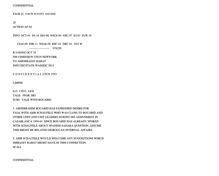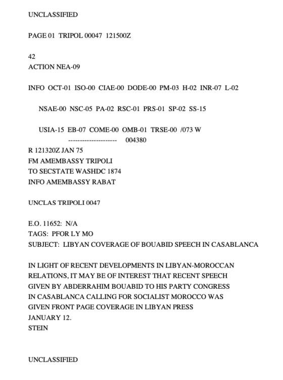 هذه الوثيقة التي وصفت بالسرية والخاصة، حذرت من خلالها مصالح الخارجية الأمريكية في ليبيا نظيرتها في الرباط، من التوافق بين النظام الليبي والمطلب الذي رفعه عبد الرحيم بوعبيد، في مؤتمر الحزب.
