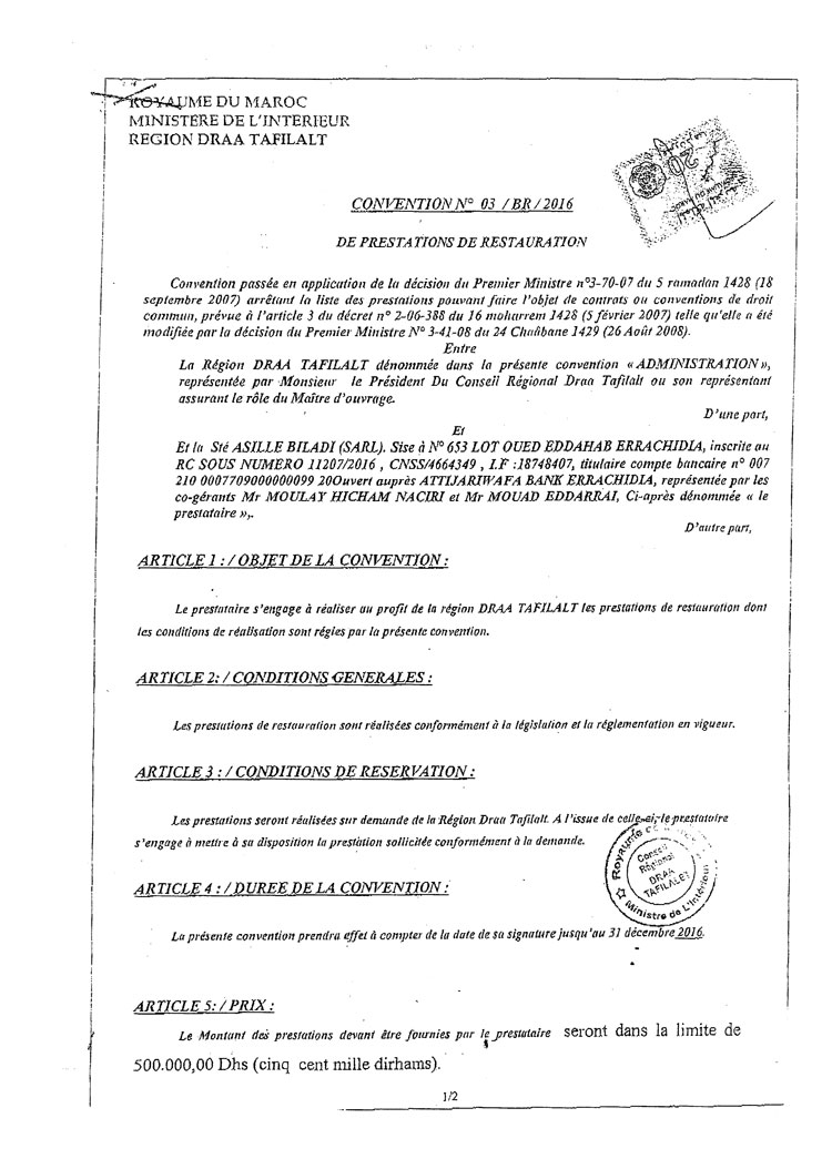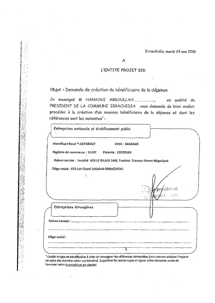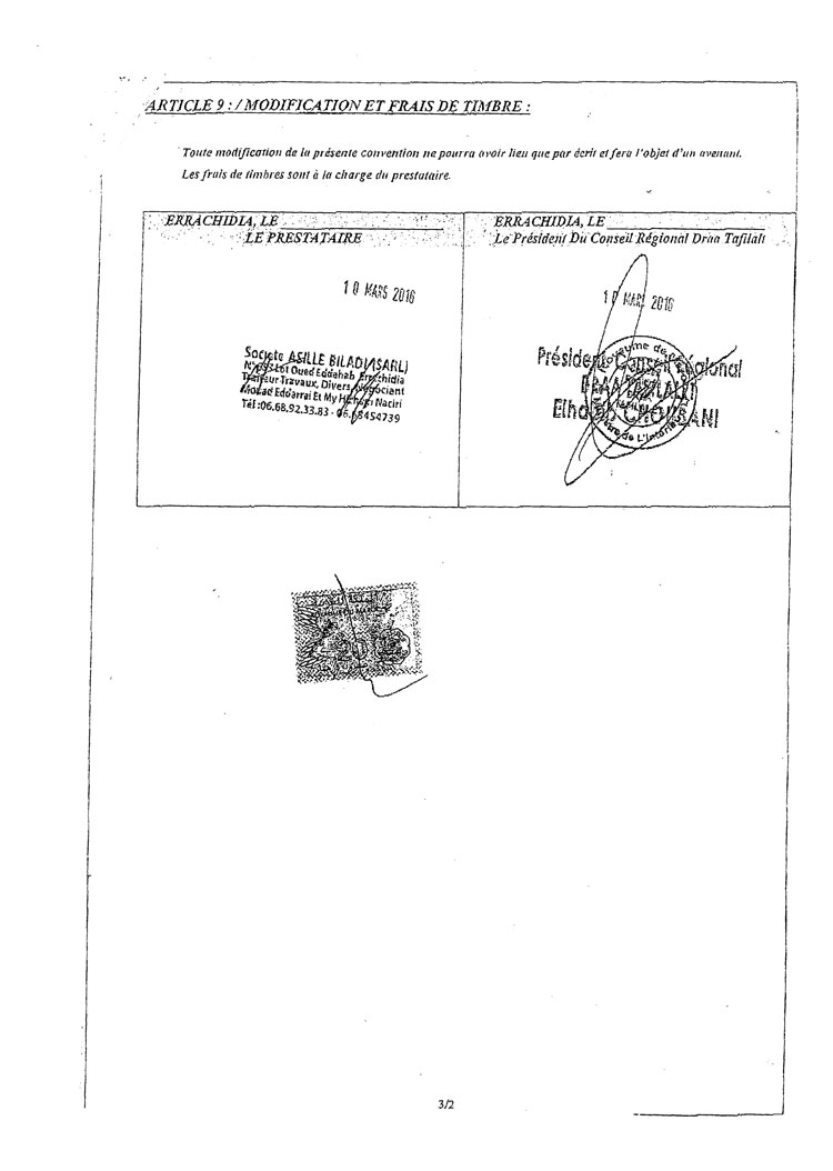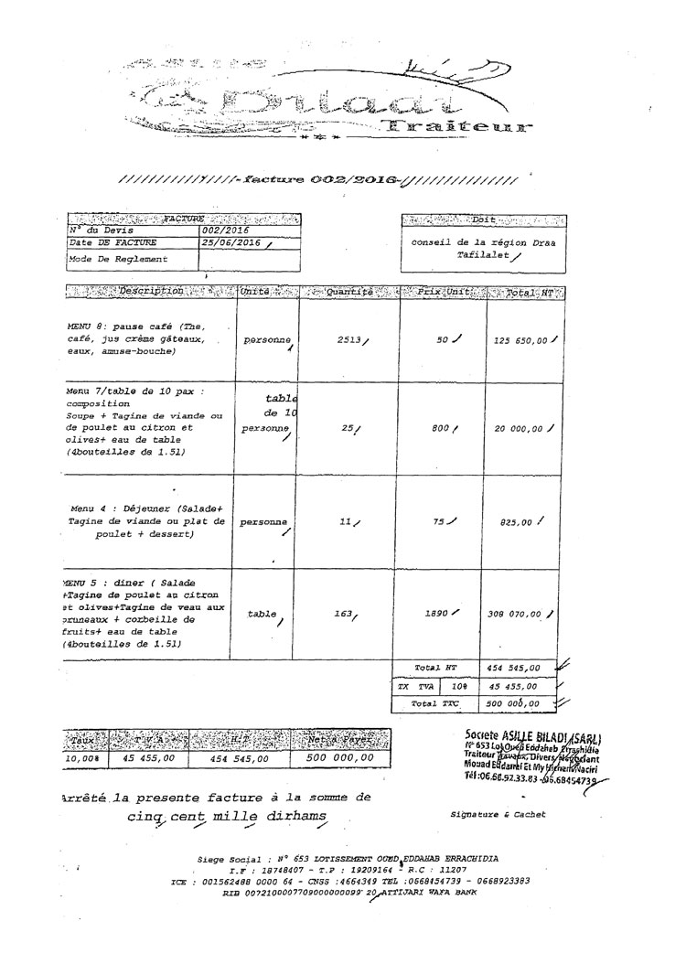 وتوصل مجلس الجهة، يوم 25 يونيو الماضي، بفاتورة من الشركة المعنية ذات السجل التجاري رقم 11207،تبين أنها في ملكية كل من هشام الناصري ومراد الراضي، وهما ينتميان إلى حزب العدالة والتنمية،وبلغت قيمة الفاتورة بالضبط 50مليون سنتيم، وهي القيمة الإجمالية المنصوص عليها في عقد الصفقة المباشرة التي تمت بين الطرفين.