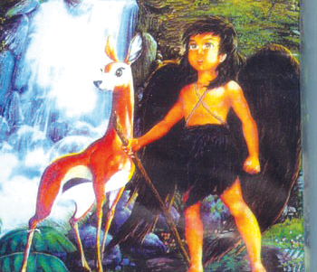 ثم أخذ الماء في الجزْرِ عن التابوت الذي فيه الطفل، وبقي التابوت في ذلك الموضع، وعلت الرمال بهبوب الرياح، وتراكمت بعد ذلك، حتى سدت باب الأجمة على التابوت، وردمت مدخل الماء إلى تلك الأجمة. فكان المد لا ينتهي إليها. وكانت مسامير التابوت قد قلقت، وألواحه قد اضطربت، عند رمي الماء إياه في تلك الأجمة. فلما اشتد الجوع بذلك الطفل، بكى واستغاث وعالج الحركة… فوقع صوته في أذن ظبية فقدت طلاها، خرج من كناسه، فحمله العقاب. فلما سمعت الصوت ظنته ولدها، فتتبعت الصوت وهي تتخيل طلاها، حتى وصلت إلى التابوت، ففحصت عنه بأظلافها، وهو ينوء ويئن من داخله، حتى طار عن التابوت لوح من أعلاه، فحنت الظبية، وحنت عليه… وألقمته حلمتها، وأروته لبنا سائغا… وما زالت تتعهده وتربيه، وتدفع عنه الأذى… ألف الطفل تلك الظبية، حتى كان بحيث إذا أبطأت عنه، اشتد بكاؤه فطارت إليه. ولم يكن بتلك الجزيرة شيء من السباع العادية، فتربى الطفل ونما، واغتذى بلبن تلك الظبية، إلى أن تم له حولان، وتدرج في المشي وأثغر، فكان يتبع تلك الظبية، وكانت هي ترفق به وترحمه وتحمله إلى مواضع فيها شجر مثمر، فكانت تطعنه ما تساقط من ثمراتها الحلوة النضيجة… فما زال الطفل مع الظباء على تلك الحال، يحكي نغمتها بصوته، حتى لا يكاد يفرق بينهما. وكذلك، يحكي جميع ما يسمعه من أصوات الطير، وأنواع سائر الحيوان محاكاة شديدة، لقوة انفعاله لما يريده… وأكثر ما كانت محاكاته، لأصوات الظباء في الاستصراخ والاستئلاف والاستدعاء والاستدفاع، إذ للحيوانات في هذه الأحوال المختلفة، أصوات مختلفة.