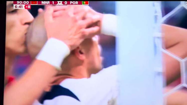 فعندما كانت المباراة، التي آلت نتيجتها للمنتخب الوطني (1-0)، تتجه لتلفظ آخر أنفاسها وتعلن المغرب متأهلا للمربع الذهبي، إلتقطت عدسات الكاميرات الناقلة للمباراة، لقطة طريفة، في حدود الدقيقة 90+7، قام بها المدافع جواد الياميق بعدما توجه إلى المدافع البرتغالي “بيبي” وقام، بعفوية، بتقبيل صلعته، تعبيرا منه عن فرحته بتضييع “بيبي” لفرصة كانت سانحة للتسجيل وتعديل النتيجة.