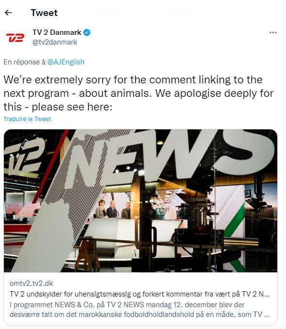 قدمت قناة “TV 2” الدنماركية اعتذارا رسميا “أسود الأطلس” بعد أن شبهتهم بالقردة، بسبب طبيعة العلاقة التي تجمع لاعبي المنتخب المغربي بأمهاتهم.