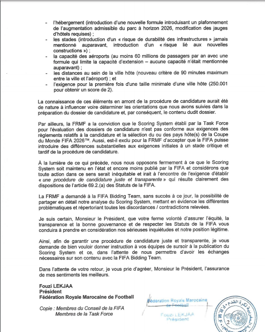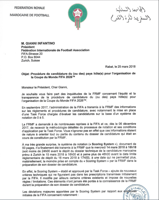 وجه فوزي لقجع، رئيس الجامعة الملكية المغربية لكرة القدم، رسالة إلى جياني إنفانتينو، رئيس الاتحاد الدولي للعبة، “فيفا”، احتجاجا، على التعديل الذي أحدث في آخر لحظة من قبل الفيفا، والذي يمنح صلاحيات واسعة للجنة التنقيط، لم تكن تعلمها الجامعة ولجنة “موروكو 2026” ، ويتيح لها إمكاينة إقصاء الملف المغربي، قبل الوصول لمرحلة التصويت.