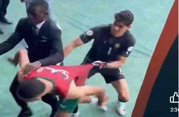 سادت أرضية ملعب “لاورينت بوكو” الذي استضاف مباراة المنتخب المغربي ضد نظيره الكونغولي حالة فوضى كبيرة بسبب مشاحنات بين لاعبي الفريقين. واستمر الشجار بين بعض لاعبي المنتخبين لفترة من الوقت قبل أن تهدأ الأمور بين الطرفين. وحسب مصادر عاينت المشاحنات فالسبب في اندلاعها بدأ عندما توجه المدرب الوطني وليد الركراكي مباشرة بعد إطلاق الحكم لصافرة نهاية المباراة التي جمعت بين المنتخبين المغربي ونظيره الكونغولي، والتي انتهت بالتعادل الإيجابي واحد لواحد، نحو مدرب منتخب جمهورية الكونغو الديمقراطية سيباستيان ديسابر من أجل مصافحته بكل روح رياضية، إلا أن اللاعب الكونغولي شانسيل مبيميا تدخل بشكل لا رياضي ووجه كلمات وحركات نابية للمدرب المغربي، مما تسبب في فقدان هذا الأخير لبرودة أعصابه. وقد انتقلت عدوى الفوضى إلى مستودع الملابس، بسبب الفوضى التي أحدثها لاعبو منتخب الكونغو الديموقراطية، خصوصا اللاعب الكونغولي شانسيل مبيمبا، الذي وجه كلاما نابيا للمهاجم يوسف النصيري بينما كان هذا الأخير في طريقه لغرف تبديل الملابس، مما دفع بالنصيري إلى مطاردته، لحسن الحظ أن بونو حاول إيقاف النصيري وثنيه عن القيام بما لا يحمد عقباه.