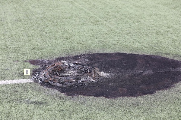 واستنادا إلى المصادر، فإن مجموعة من الجانحين قاموا في الصباح الباكر من يوم السبت المنصرم، باقتحام الملعب، بعد تكسير السياج الحديدي الخارجي، كما أدخلوا عجلتين مطاطيتين وأضرموا فيهما النيران، وتركوهما وسط الملعب، قبل أن يلوذوا بالفرار، كما أوضحت ذلك كاميرات للمرقبة موجودة بالقرب من الملعب. وحصلت عناصر الشرطة على نسخ من شريط فيديو يوثق لحظات دخول الملعب وإشعال النيران، وذلك من أجل تحديد هويات الأظناء. وفي الوقت الذي لم تعرف دوافع الإقدام على هذا الفعل، إلا أن بعض المصادر لم تستبعد أن يكون الدافع مرتبطا بدوري رمضان، الذي كان مقررا أن يحتضنه الملعب الذي استبشر سكان الحي بافتتاحه أخيرا.