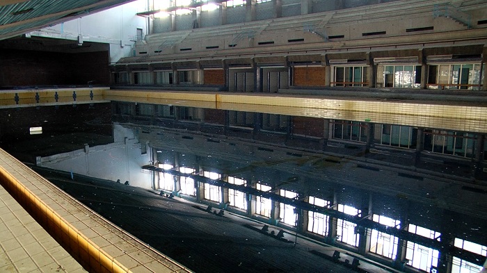 ويقتضي الوصول إلى المسبح الأولمبي أسفل المركب الرياضي محمد الخامس نزول طابقين، في غياب الإنارة والمرافق، بحيث باتت مياه المسبح سوداء راكدة، تنتشر فيها النفايات بشتى أنواعها في ظل انعدام التهوية بالفضاء الرياضي، وتآكل الأبواب الخشبية وانهيار الأسقف.