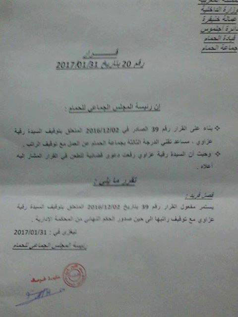 كما عبر المحتجون خلال الوقفة نفسها عما وصفوه بسوء تسيير شؤون الجماعة القروية المذكورة من طرف الرئيسة، التي عملت بحسب تصريحات المحتجين، على نهج سياسة تصفية حساباتها مع الموظفين الجماعيين، والتي لم تكتف بإصدارها قرار الاقتطاع، بعدما أصدرت قرارا آخر بتاريخ 31 يناير الماضي عدد 20 يقضي باستمرار قرار توقيف موظفة عن العمل ووقف راتبها، إلى حين صدور الحكم النهائي من المحكمة الإدارية، في محاولة من رئيسة الجماعة القروية الحمام معاقبة الموظفة على وضعها ملفا لدى المحكمة الإدارية بمكناس في مواجهة رئيسة الجماعة القروية، من أجل إسقاط قرار التوقيف.