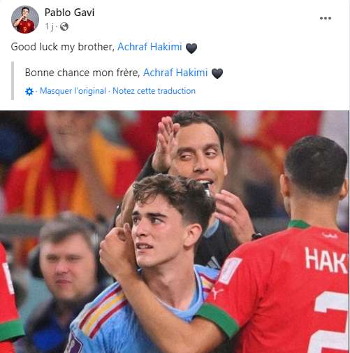 فاجأ نجم المنتخب الإسباني، “بابلو” غافي”، الدولي المغربي أشرف حكيمي برسالة عبر صفخته الرسمية في موقع التواصل الاجتماعي “فايسبوك”، عقب الخسارة والإقصاء أمام المنتخب الوطني في المباراة التي جمعت المنتخبين برسم دور ثمن نهائي كأس العالم قطر 2022 في ملعب “المدينة التعليمية”.